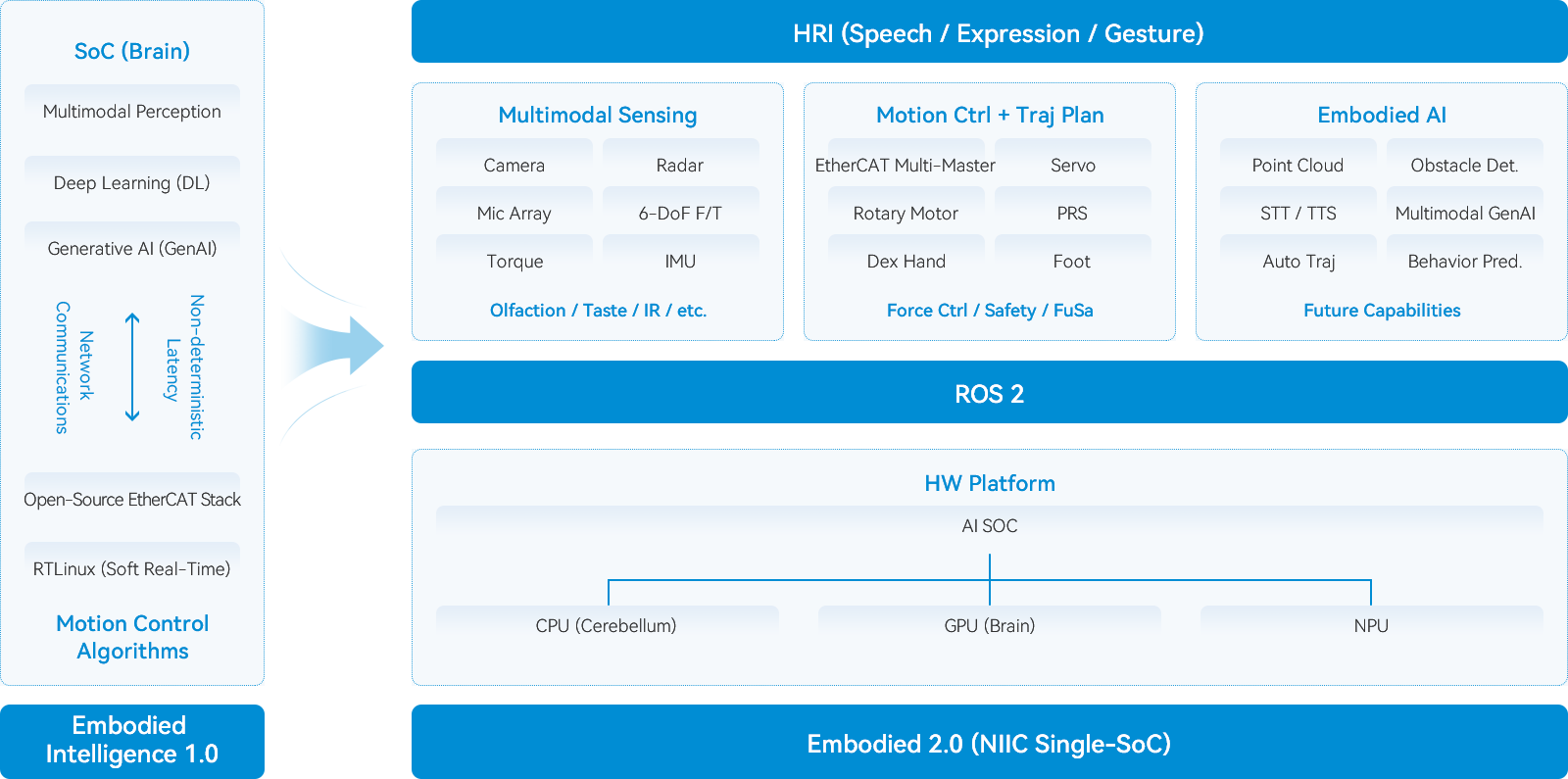 Equipped with a dual platform tiered computing architecture, the AI computing power can reach up to 2070 TOPS, meeting the computing power requirements of robots in all scenarios;